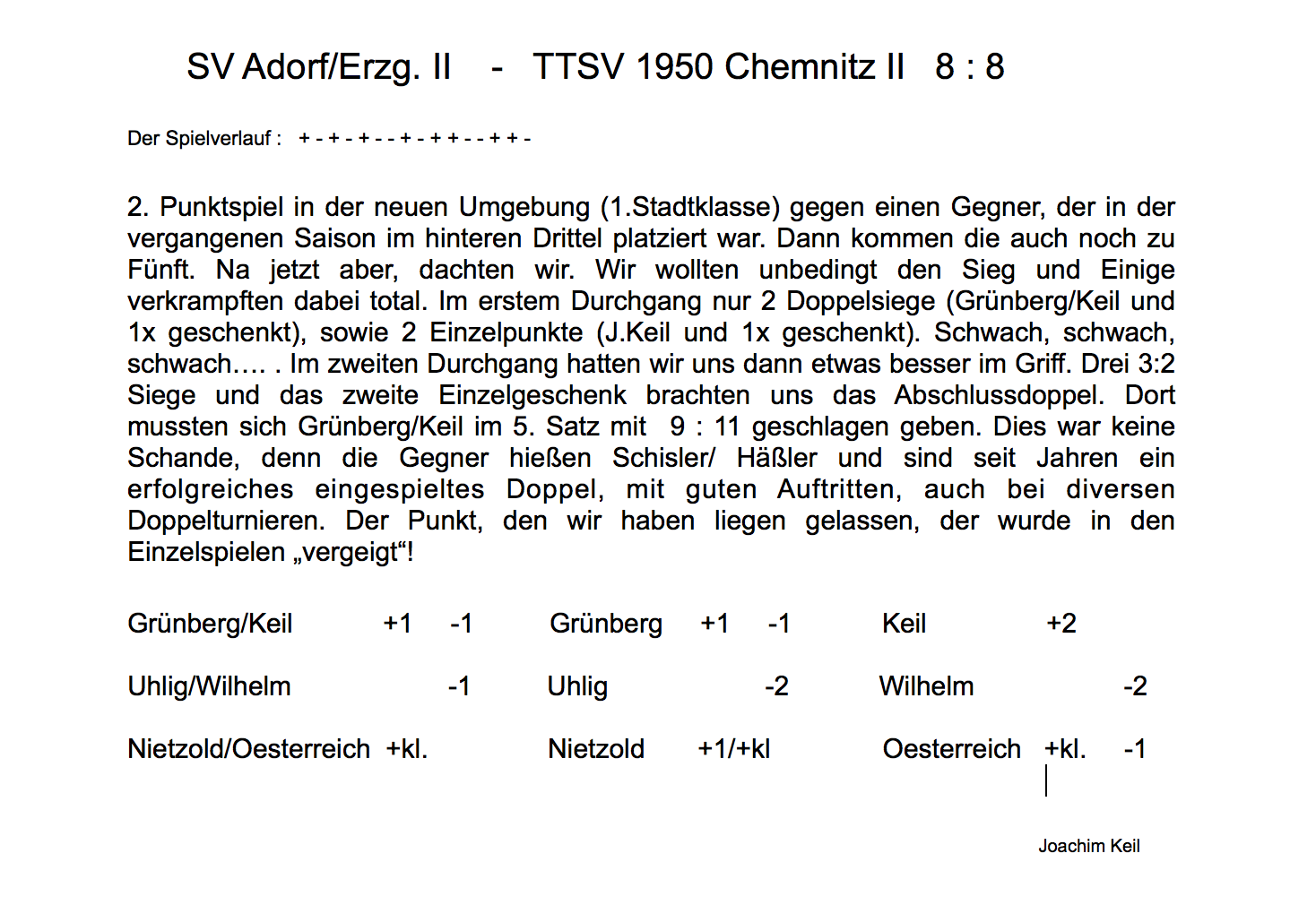 Punktspielbericht 1. Stadtklasse: Adorf II – Limbach III 6:9