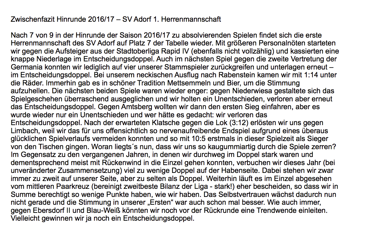 • Punktspielbericht 1. Stadtklasse Kleinolbersdorf – Adorf II 4:11 (16.11.17)